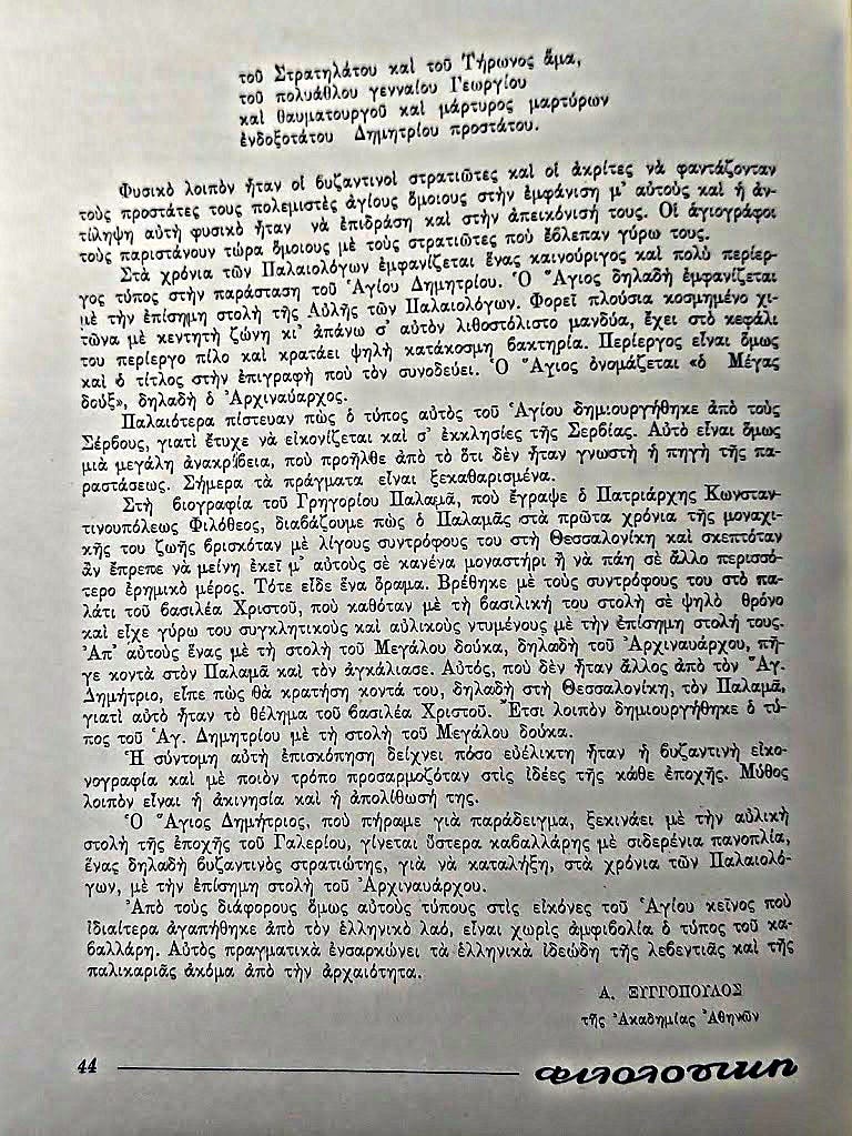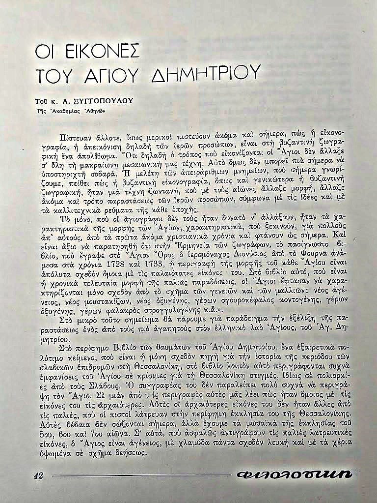 Ενόψει των ανωτέρω, και με αφορμή τον εορτασμό της μνήμης του Αγίου Δημητρίου, αξίζει να θυμηθούμε τι είχε διαπιστώσει για τις απεικονίσεις της μορφής του μεγάλου αυτού Αγίου μας στο ετήσιο περιοδικό «Φιλολογική Πρωτοχρονιά» του 1971 ο Ανδρέας Ξυγγόπουλος (1891-1979), τακτικός καθηγητής της Βυζαντινής αρχαιολογίας στο Αριστοτέλειο Πανεπιστήμιο Θεσσαλονίκης: