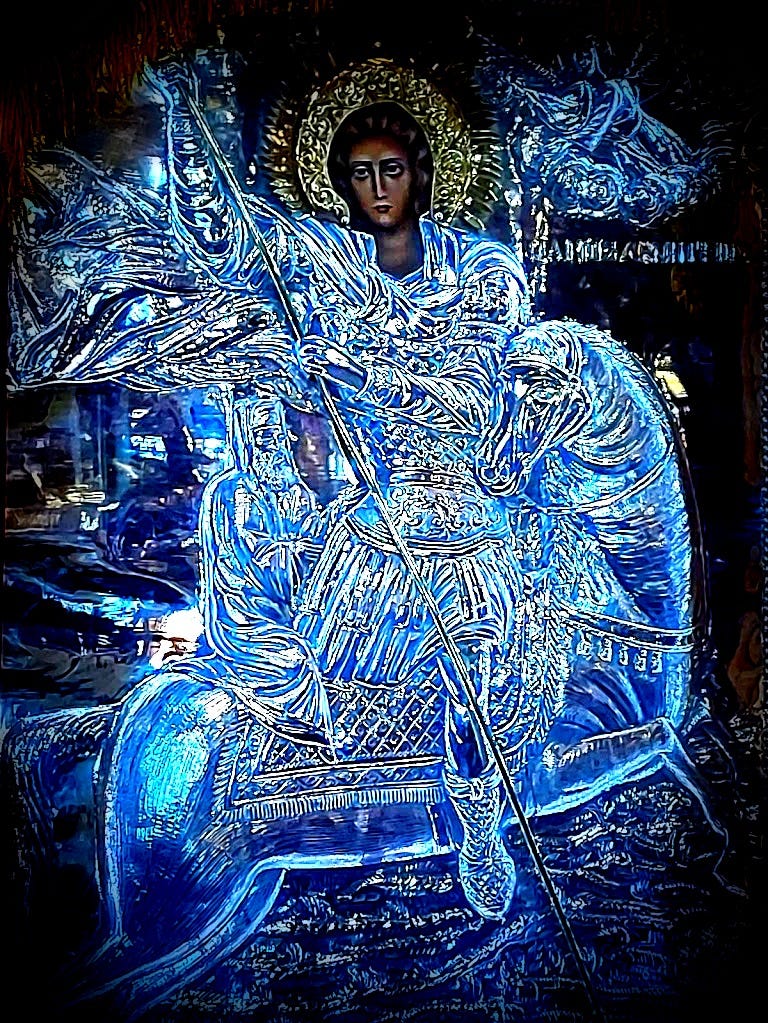 ᾿Απὸ τοὺς διάφορους ὅμως αὐτοὺς τύπους στὶς εἰκόνες τοῦ ῾Αγίου κεῖνος ποὺ ἰδιαίτερα αγαπήθηκε ἀπὸ τὸν ἑλληνικό λαό, εἶναι χωρὶς ἀμφιβολία ὁ τύπος τοῦ καβαλλάρη. Αὐτὸς πραγματικά ενσαρκώνει τὰ ἑλληνικά ιδεώδη της λεβεντιᾶς καὶ τῆς παλικαριᾶς ἀκόμα ἀπὸ τὴν ἀρχαιότητα.