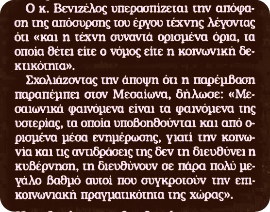 «και η τέχνη συναντά ορισμένα όρια, τα οποία θέτει είτε ο νόμος είτε η κοινωνική δεκτικότητα» (βλ. π.χ. εφημ. «Ελευθεροτυπία», 13.12.2003, σελ. 41)1.