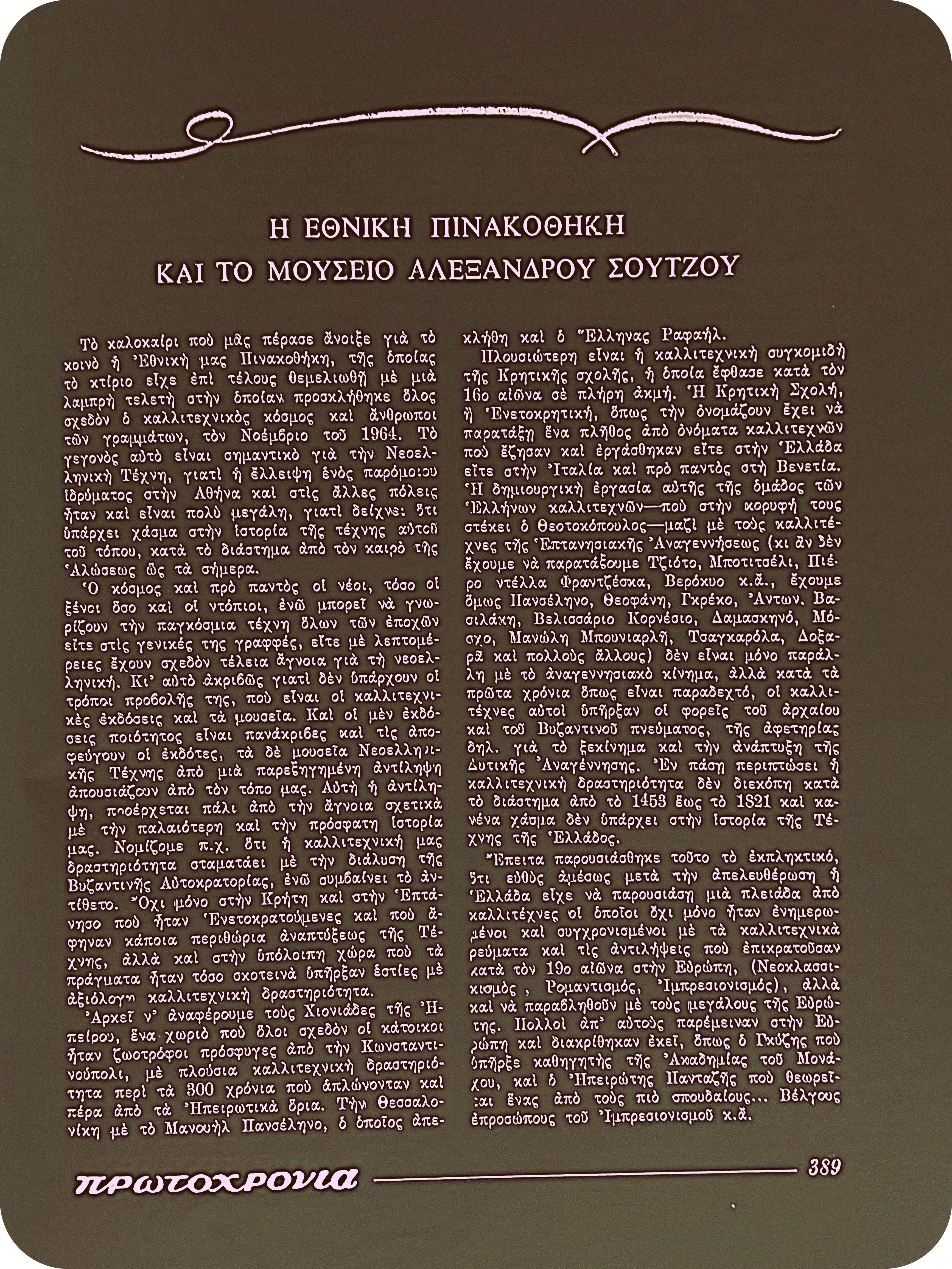 ΠΡΟΣΟΧΗ: Στο ίδιο τεύχος της «ΦΙΛΟΛΟΓΙΚΗΣ ΠΡΩΤΟΧΡΟΝΙΑΣ» (1971) είχε δημοσιευθεί ένα ευσύνοπτο κείμενο του ζωγράφου-χαρκάκτη Κώστα Μαλάμου με τίτλο «Η Εθνική Πινακοθήκη και το μουσείο Αλεξάνδρου Σούτζου» (σελ. 389 επ.), στο οποίο o αρθρογράφος μετέφερε τα λόγια του τότε Διευθυντή της Πινακοθήκης Μαρίνου Καλλιγά, που είναι άκρως αποκαλυπτικά για την θεαματική λοξοδρόμηση του σημερινού μουσείου από τον αρχικό προορισμό του: