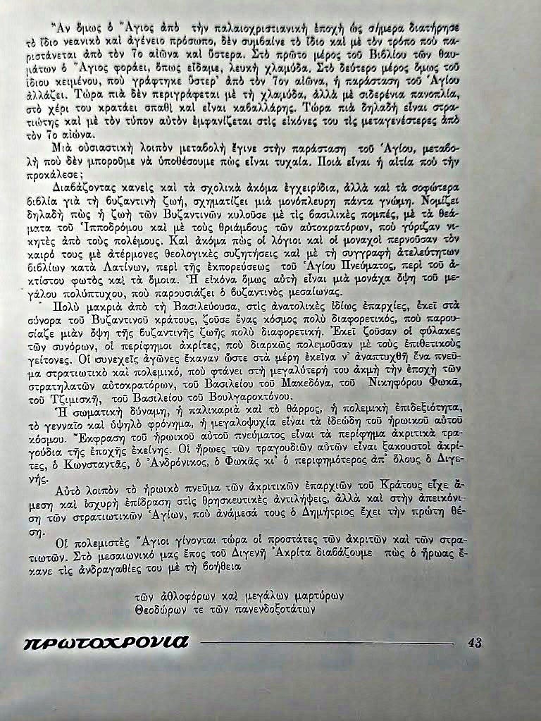 Αὐτὸ λοιπὸν τὸ ἡρωικὸ πνεῦμα τῶν ἀκριτικῶν ἐπαρχιῶν τοῦ Κράτους εἶχε ἄμεση καὶ ἰσχυρὴ ἐπίδραση στις θρησκευτικὲς ἀντιλήψεις, ἀλλὰ καὶ στὴν ἀπεικόνιση τῶν στρατιωτικῶν ῾Αγίων, ποὺ ἀνάμεσά τους ὁ Δημήτριος ἔχει τὴν πρώτη θέση.