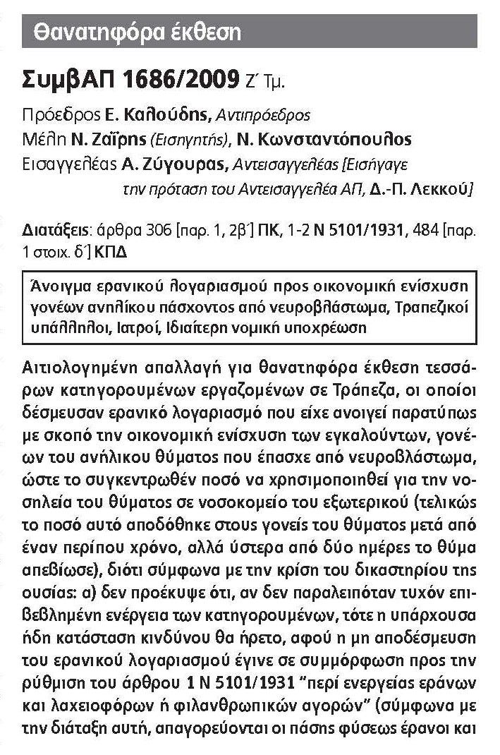 Πέραν δε τούτου, θα ανέμενε κανείς από το ίδιο δικαστήριο να είχε ασχοληθεί σοβαρότερα με την επίμαχη υπόθεση, η οποία άπτεται δυσχερών δογματικών ζητημάτων και όχι να επικυρώσει χωρίς ιδιαιτέρα βάσανο την απαλλακτική κρίση του Συμβουλίου, στερώντας την δυνατότητα από τους εγκαλούντες να πληροφορηθούν τεκμηριωμένα αν έχασαν το άρρωστο παιδί τους πολύ πιο γρήγορα απ’ όσο θα ήταν ενδεχομένως εφικτό να ζήσει, απλώς επειδή έπεσαν θύματα ενός συνδυασμού ατυχών συγκυριών (δηλαδή της ύπαρξης ενός νόμου του 1931 περί ερανικού λογαριασμού και της τυπολατρικής εφαρμογής του από υπαλλήλους μιας Τράπεζας, η οποία πάντως είχε δεχθεί να ανοίξει ο λογαριασμός υπέρ των γονέων του παθόντος παρά την έλλειψη της απαιτούμενης άδειας) ή, αντιθέτως, αν η απώλεια του άρρωστου παιδιού τους κατά την συγκεκριμένη χρονική στιγμή ήταν προϊόν μιας εσφαλμένης (και κατά τούτο καταλογιστής) επίλυσης συγκρούσεως καθηκόντων εκ μέρους των κατηγορουμένων.