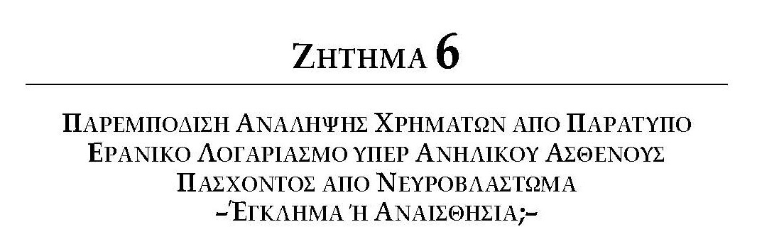 Την ίδια ημέρα, όμως, οι αρμόδιοι τραπεζικοί υπάλληλοι δέσμευσαν τον επίμαχο λογαριασμό, επειδή διαπίστωσαν ότι σε αυτόν γίνονται καταθέσεις υπό τον τύπο των ερανικών εισφορών κατά παράβαση του άρ. 1 του Ν. 5101/1931 (“περί ενεργείας εράνων και λαχειοφόρων ή φιλανθρωπικών αγορών”)5, επικαλούνται δε και την σχετική επιστολή του τότε Υφυπουργού Υγείας & Πρόνοιας, καθώς και την από 8.2.2000 υπηρεσιακή εγκύκλιο της Εθνικής Τράπεζας της Ελλάδος που προέβλεπε ότι τα καταστήματα θα συνέχιζαν να δέχονται αιτήματα για το άνοιγμα τραπεζικού λογαριασμού με σκοπό την συλλογή χρημάτων, υπό την προϋπόθεση ότι οι ενδιαφερόμενοι θα προσκομίζουν την απαιτούμενη κατά τον ανωτέρω νόμο άδεια που δίδεται με κοινή απόφαση των Υπουργών Οικονομικών και Υγείας Πρόνοιας.