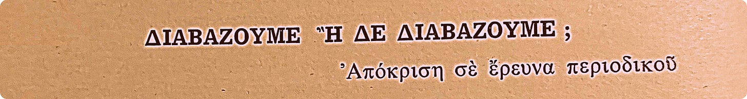 Στον πέμπτο τόμο των Απάντων του Ανδρέα Καρκαβίτσα (επιμ.: Γ. Βαλέτας, εκδ. οίκ. “Χρήστος Γιοβάνης“, Αθήνα 1973, σελ. 94/95), έχει συμπεριληφθεί μια «Απόκριση σε έρευνα περιοδικού» με τίτλο «Διαβάζουμε ή δε διαβάζουμε;».