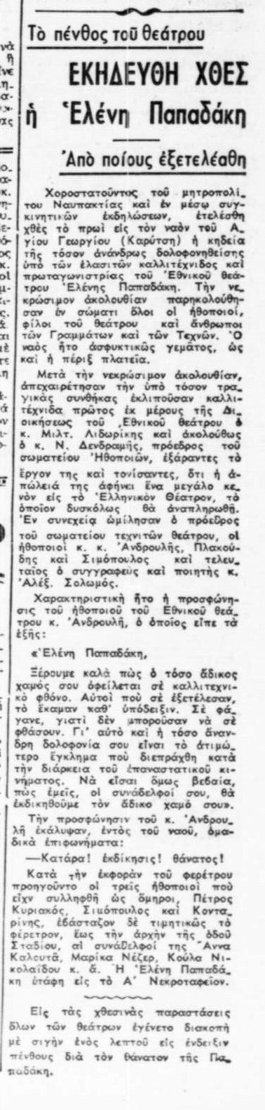 «Χοροστατοῦντος τοῦ μητροπολίτου Ναυπακτίας καὶ ἐν μέσῳ συγκινητικῶν ἐκδηλώσεων, ἐτελέσθη χθὲς τὸ πρωὶ εἰς τὸν ναὸν τοῦ Ἁγίου Γεωργίου (Καρύτση) ἡ κηδεία τῆς τόσον ἀνάνδρως δολοφονηθείσης ὑπό των ἐλασιτὼν καλλιτέχνιδος καὶ πρωταγωνιστρίας τοῦ Ἐθνικοῦ Θεάτρου Ἑλένης Παπαδάκη. Τὴν νεκρώσιμον ἀκολουθίαν παρηκολούθησαν ἐν σώματι ὅλοι οἱ ἠθοποιοί, φίλοι τοῦ θεάτρου καὶ ἄνθρωποι τῶν Γραμμάτων καὶ τῶν Τεχνῶν. Ὁ ναὸς ἦτο ἀσφυκτικῶς γεμᾶτος, ὡς καὶ ἡ πέριξ πλατεῖα.