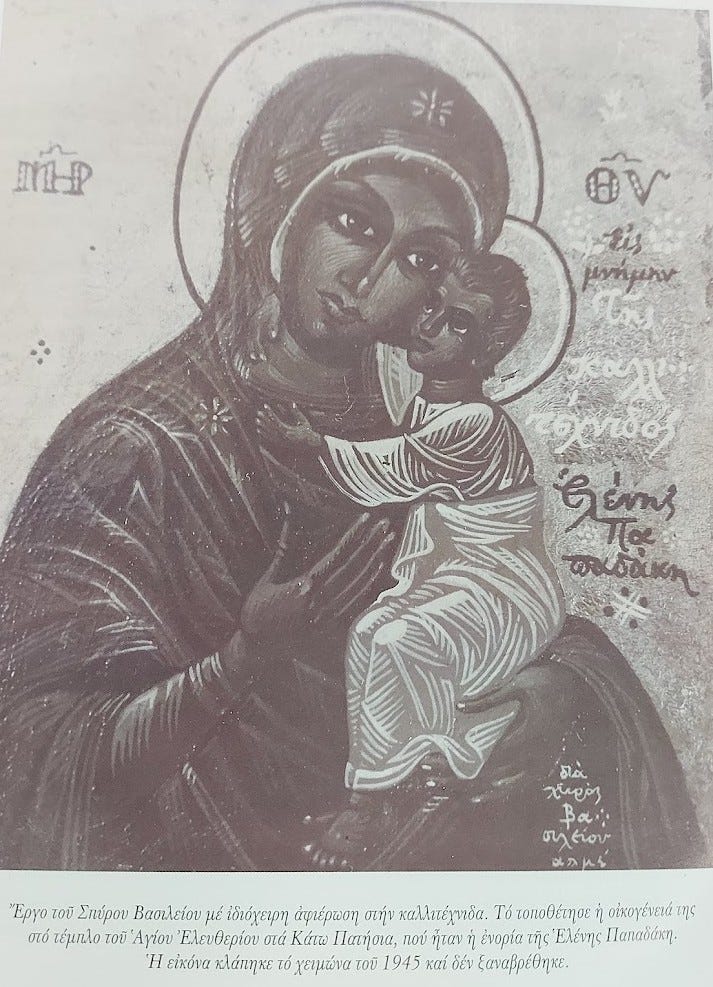 Σε ό,τι αφορά την εικόνα της Υπεραγίας Θεοτόκου, είναι έργο του Σπύρου Βασιλείου με ιδιόχειρη αφιέρωση στην καλλιτέχνιδα. Το τοποθέτησε η οικογένεια της Ελένης Παπαδάκη στο τέμπλο του Αγίου Ελευθερίου στα Πατήσια, ενορίας της ηθοποιού. Δυστυχώς, η εικόνα εκλάπη τον χειμώνα του 1945 και έκτοτε δεν βρέθηκε ποτέ!