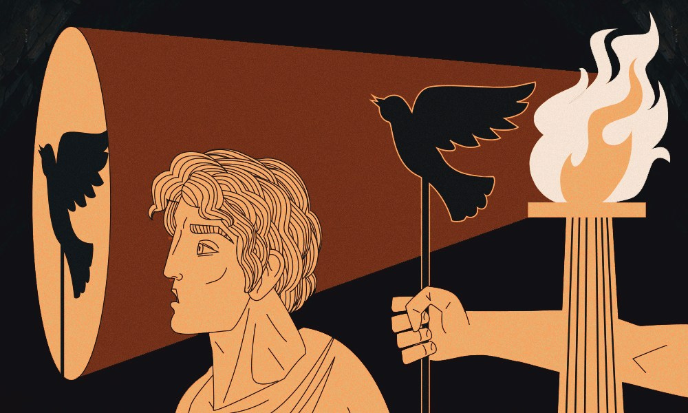 Το κλουβί ως φυλακή παραπέμπει και στην παραβολή του σπηλαίου του Πλάτωνος, όπου κρατούνται όμηροι του «συστήματος παραπλανητικής προβολής» της πραγματικότητας οι αποχαυνωμένοι δεσμώτες4. Στην σύγχρονη εποχή κινητήριος μοχλός αυτού του συστήματος είναι τα Μέσα Μαζικής Ενημέρωσης (ορθότερα: Εξαπάτησης).