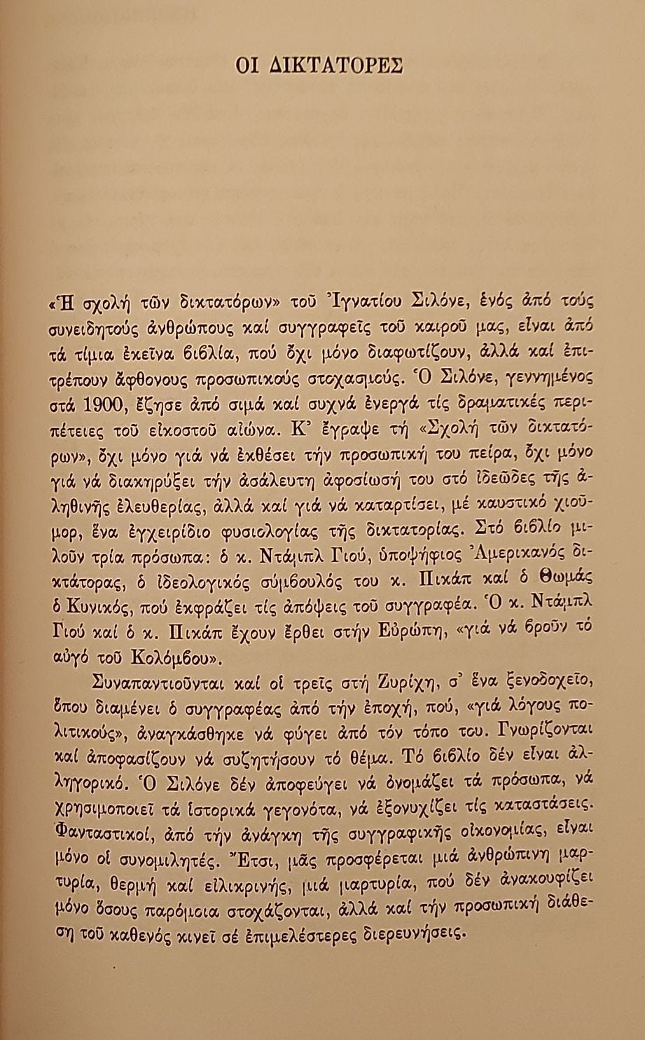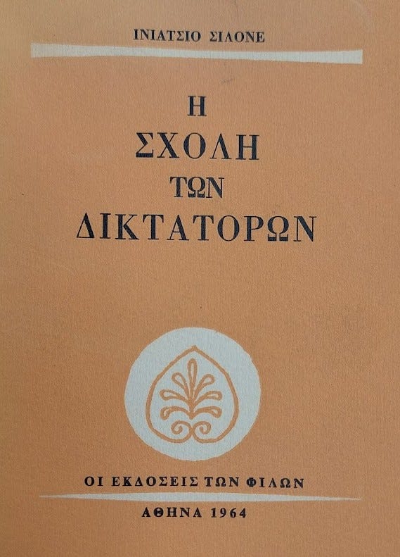 «Ἡ σχολή τῶν δικτατόρων» τοῦ Ἰγνατίου Σιλόνε, ἑνός ἀπὸ τοὺς συνειδητούς ἀνθρώπους καὶ συγγραφεῖς τοῦ καιροῦ μας, εἶναι ἀπὸ τὰ τίμια ἐκεῖνα βιβλία, ποὺ ὄχι μόνο διαφωτίζουν, ἀλλά καὶ ἐπιτρέπουν ἄφθονους προσωπικούς στοχασμούς. Ὁ Σιλόνε, γεννημένος στὰ 1900, ἔζησε ἀπό σιμά καί συχνά ἐνεργά τίς δραματικές περιπέτειες τοῦ εἰκοστοῦ αἰώνα. Κ’ ἔγραψε τὴ «Σχολή των δικτατόρων», ὄχι γιὰ νὰ ἐκθέσει τὴν προσωπική του πείρα, ὄχι μόνο γιὰ νὰ διακηρύξει τὴν ἀσάλευτη ἀφοσίωσή του στὸ ἰδεῶδες τῆς ἀληθινῆς ἐλευθερίας, ἀλλά καὶ γιὰ νὰ καταρτίσει, μέ καυστικό χιοῦμορ, ἕνα ἐγχειρίδιο φυσιολογίας τῆς δικτατορίας. Στὸ βιβλίο μιλοῦν τρία πρόσωπα: ὁ κ. Ντάμπλ Γιού, ὑποψήφιος ᾿Αμερικανός δικτάτορας, ὁ ἰδεολογικός σύμβουλος τοῦ κ. Πικάπ καὶ ὁ Θωμάς ὁ Κυνικός, ποὺ ἐκφράζει τὶς ἀπόψεις τοῦ συγγραφέα. Ὁ κ. Ντάμπλ Γιού καὶ ὁ κ. Πικάπ ἔχουν ἔρθει στὴν Εὐρώπη, «γιὰ νὰ βροῦν τὸ αὐγὸ τοῦ Κολόμβου».
