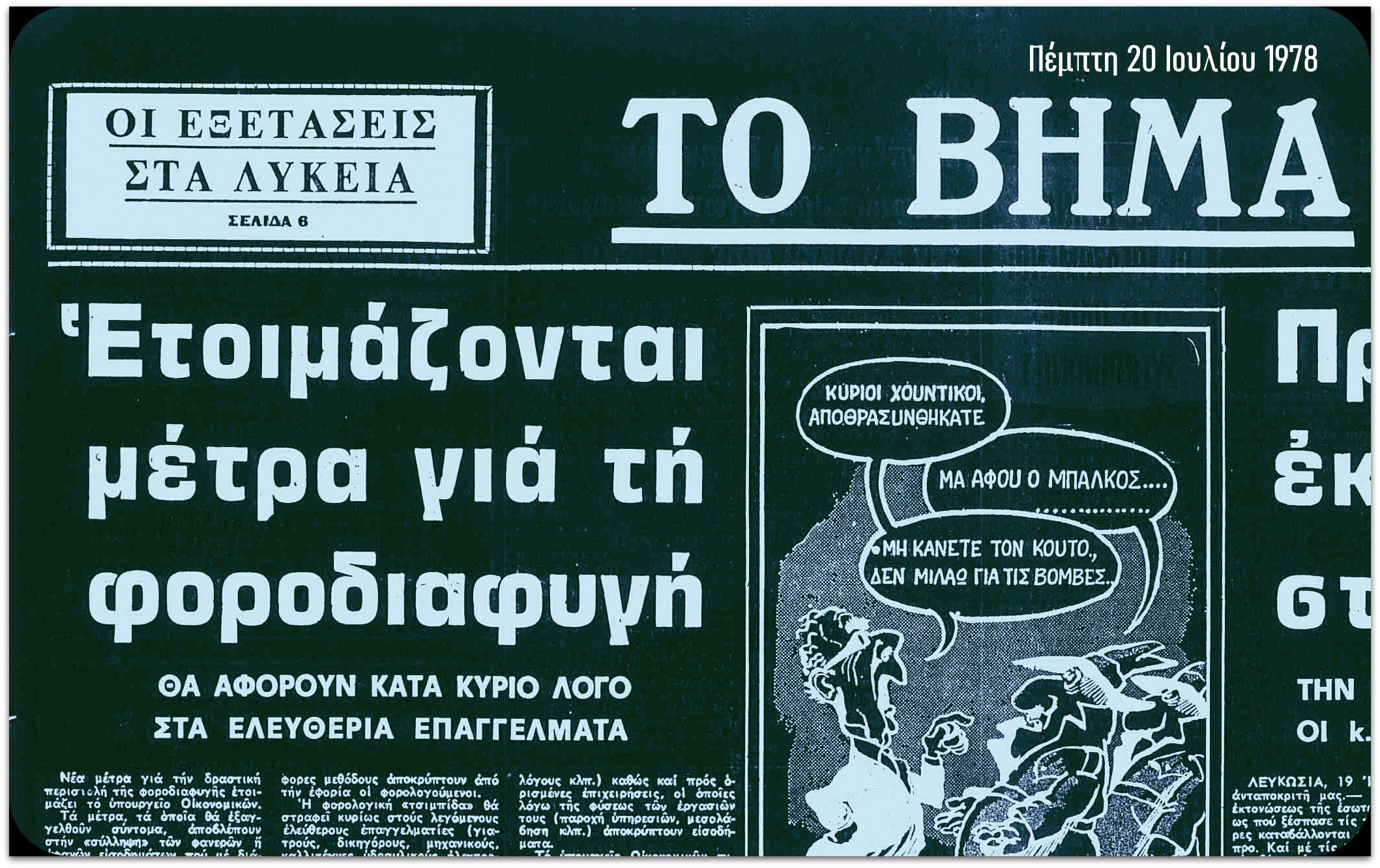 Το δούλεμα που τρώμε από τον 20ό αιώνα σε σχέση με την προπαγανδιζόμενη καταπολέμηση της φοροδιαφυγής προκύπτει με ενάργεια από το πρωτοσέλιδο της εφημερίδας «Το Βήμα» που είχε κυκλοφορήσει στις 20 Ιουλίου 1978.