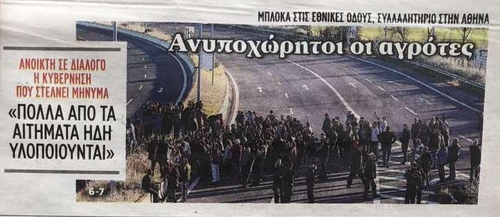 Όποιος διαβάσει την είδηση που είναι γραμμένη στο πρωτοσέλιδο πάνω-πάνω δεξιά, είναι πιθανό να νομίζει ότι βρίσκεται μπροστά σε εφημερίδα του 2026 και όχι του 2024, αφού και πριν από δύο χρόνια οι αγρότες είχαν στήσει μπλόκα στις εθνικές οδούς: