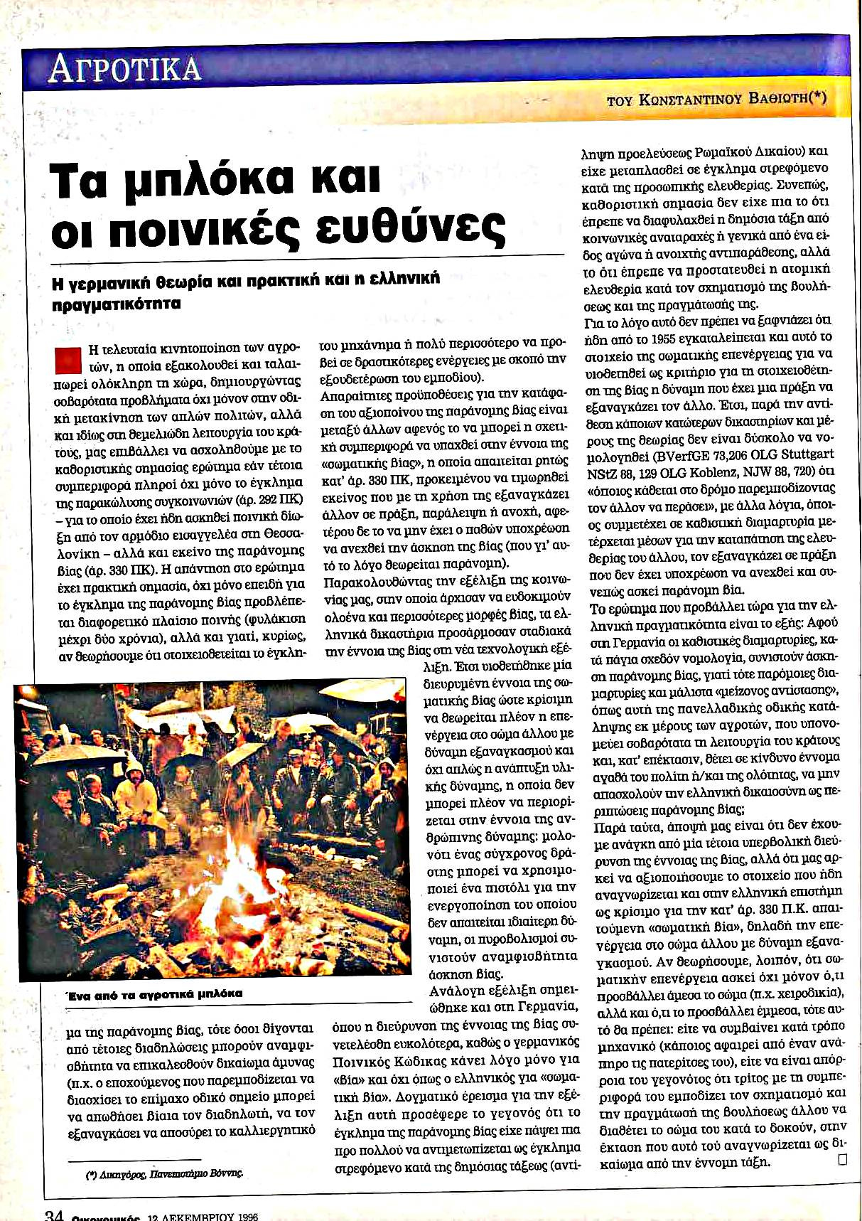 Ο γράφων είχε δημοσιεύσει στον «Οικονομικό Ταχυδρόμο» άρθρο υπό το πρίσμα του Ποινικού Δικαίου (ειδικότερα των εγκλημάτων της παρακώλυσης συγκοινωνιών και της παράνομης βίας) με αφορμή τα μπλόκα που είχαν στήσει οι αγρότες το 1996!