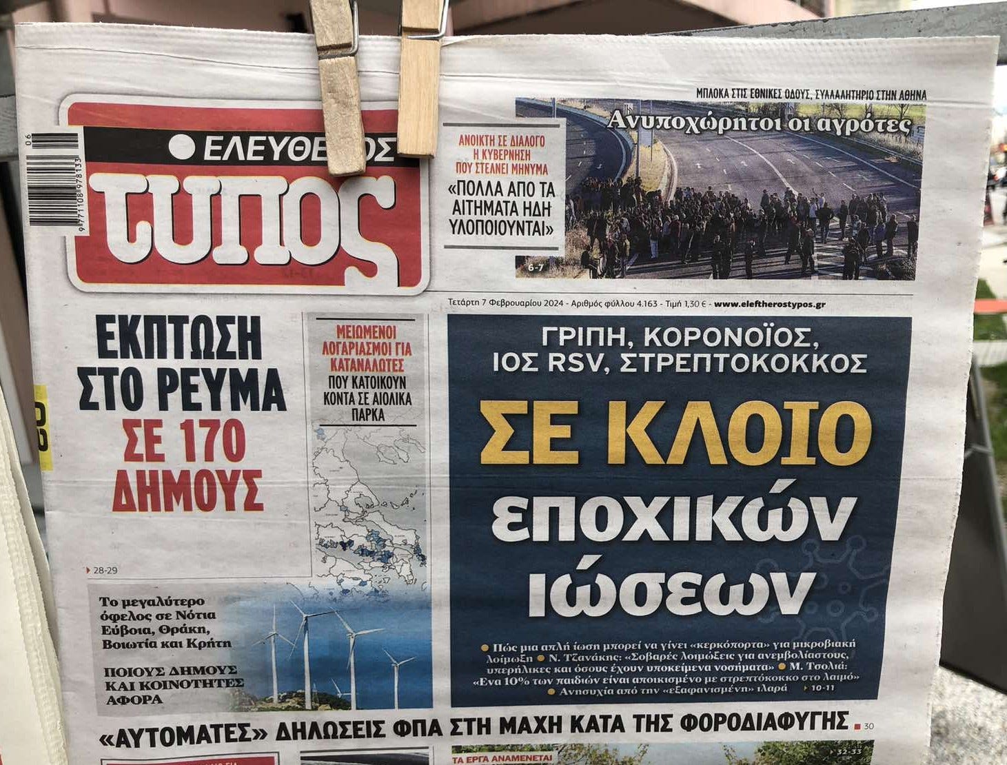 «Σε κλοιό εποχικών ιώσεων» είναι ο τίτλος που δεσπόζει στο πρωτοσέλιδο, της μητσοτακόπληκτης φυλλάδας η οποία προσκυνά νυχθημερόν την «Νέα Δικτατορία».