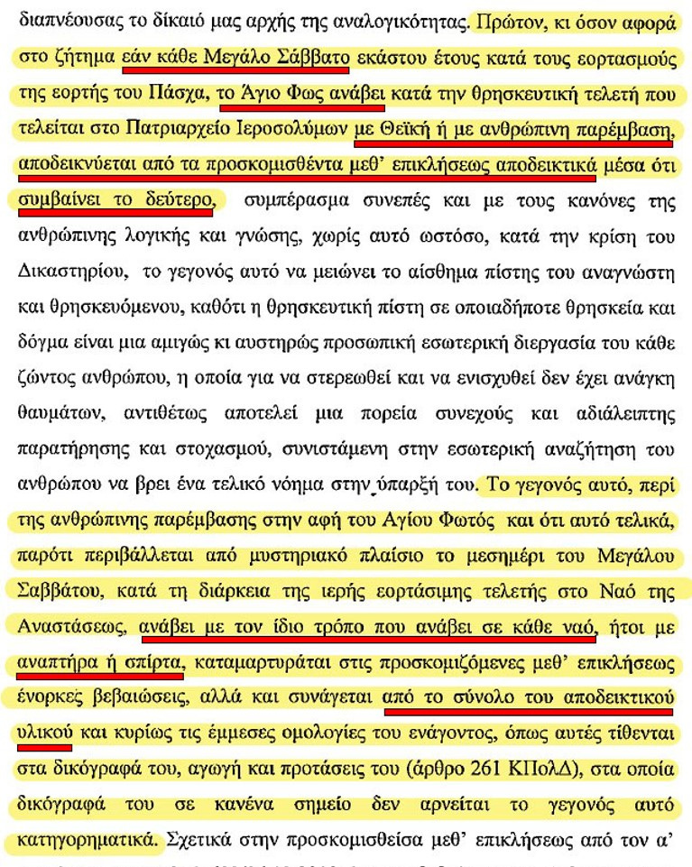 Δεν ξέρω αν πρέπει να γελάμε ή να κλαίμε με το θράσος και την αλαζονεία του δικαστηρίου που ουδόλως δίστασε να κρίνει ως δήθεν αποδεδειγμένο (!) ότι δεν υφίσταται θαύμα στην αφή του Αγίου Φωτός, το οποίο "ανάβει με αναπτήρα ή σπίρτα". Το επόμενο ποιο θα είναι; Δικαστική απόφαση πιστοποιούσα ότι δεν έλαβε χώρα η Ανάστασις του Κυρίου, διότι τούτο δήθεν προκύπτει από τα διδάγματα της λογικής και της κοινής πείρας (και από το σύνολο του "μεθ'"επικλήσεως προσκομισθέντος αποδεικτικού υλικού);
