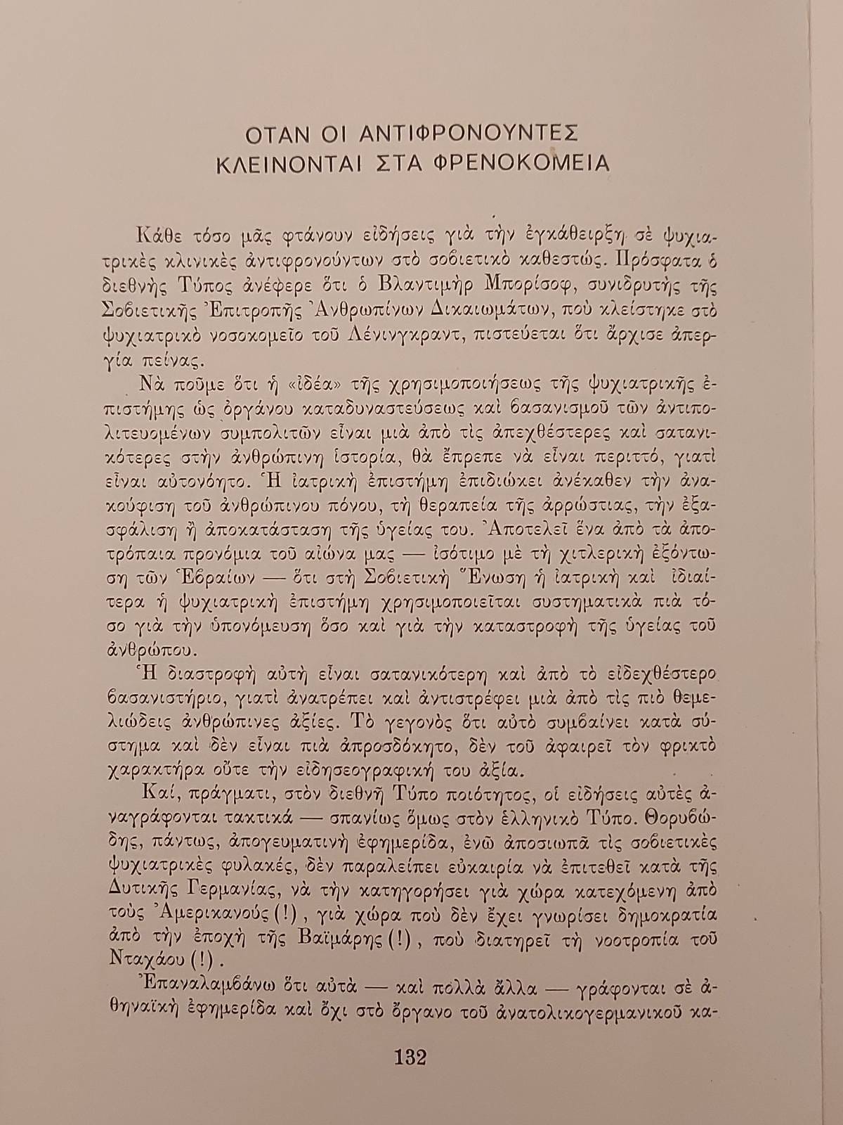 Στὴ Σοβιετικὴ Ἕνωση γίνεται τώρα κάτι χειρότερο ἀπὸ τὴν ἐποχὴ τῶν πρωτογόνων Σλάβων ποὺ ἐξόντωναν τοὺς μειοψηφοῦντες καὶ τοὺς ἔκαιγαν τὰ σπίτια (ἢ τὶς καλύβες) τους. Τώρα ἡ διαφωνία θεωρεῖται ἀρρώστια. Ἡ κυβέρνηση καθορίζει τί είναι ψυχική υγεία καὶ τί εἶναι ψυχασθένεια. Φτάσαμε δηλαδὴ σὲ ἕνα βάθος ποὺ τὸ πιστεύαμε ἀπύθμενο. Σὲ μιὰ διαστροφὴ ἰσόβαθμη μὲ ἐκείνη τοῦ ψυχροῦ ἐπιστήμονα ἐγκληματία Χίμμλερ.