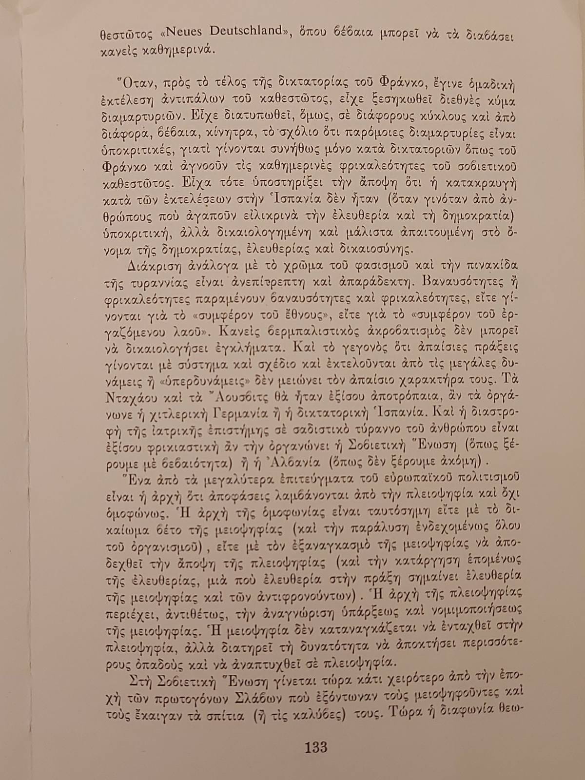 Διάκριση ανάλογα μὲ τὸ χρῶμα τοῦ φασισμοῦ καὶ τὴν πινακίδα τῆς τυραννίας εἶναι ἀνεπίτρεπτη καὶ ἀπαράδεκτη. Βαναυσότητες ἢ φρικαλεότητες παραμένουν βαναυσότητες καὶ φρικαλεότητες, εἴτε γίγονται γιὰ τὸ «συμφέρον τοῦ ἔθνους», εἴτε γιὰ τὸ «συμφέρον τοῦ ἐργαζόμενου λαοῦ». Κανεὶς βερμπαλιστικὸς ἀκροβατισμὸς δὲν μπορεῖ νὰ δικαιολογήσει ἐγκλήματα. Καὶ τὸ γεγονὸς ὅτι ἀπαίσιες πράξεις γίνονται μὲ σύστημα καὶ σχέδιο καὶ ἐκτελοῦνται ἀπὸ τὶς μεγάλες δυνάμεις ἢ «ὑπερδυνάμεις» δὲν μειώνει τὸν ἀπαίσιο χαρακτήρα τους. Τὰ Νταχάου καὶ τὰ Ἄουσβιτς θὰ ἦταν ἐξίσου ἀποτρόπαια, ἂν τὰ ὀργάνωνε ἡ χιτλερική Γερμανία ἢ ἡ δικτατορικὴ Ἱσπανία. Καὶ ἡ διαστροφὴ τῆς ἰατρικῆς ἐπιστήμης σὲ σαδιστικό τύραννο τοῦ ἀνθρώπου εἶναι ἐξίσου φρικιαστικὴ, ἂν τὴν ὀργανώνει ἡ Σοβιετικὴ Ἕνωση (ὅπως ξέρουμε μὲ βεβαιότητα) ἢ ἡ Ἀλβανία (ὅπως δὲν ξέρουμε ἀκόμη).