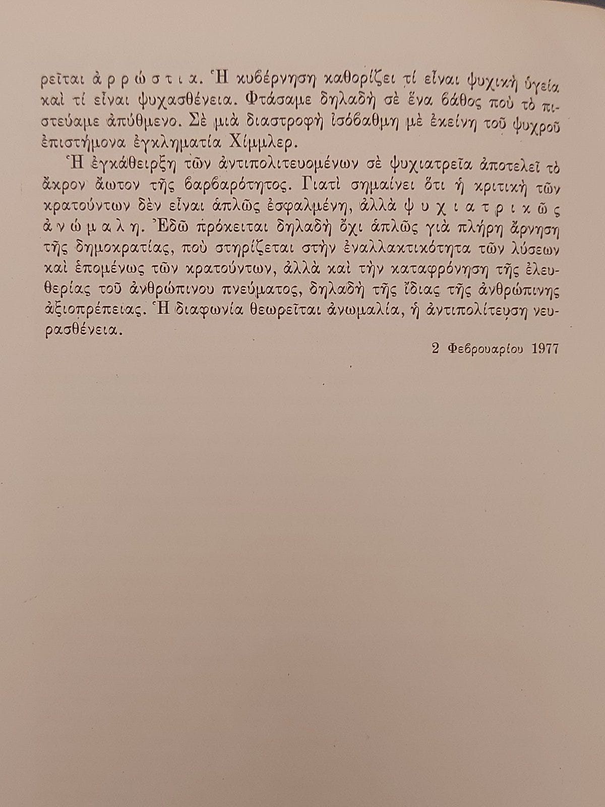 Ἡ ἐγκάθειρξη τῶν ἀντιπολιτευομένων σὲ ψυχιατρεῖα ἀποτελεῖ τὸ ἄκρον ἄωτον τῆς βαρβαρότητος. Γιατί σημαίνει ὅτι ἡ κριτικὴ τῶν κρατούντων δὲν εἶναι ἁπλῶς ἐσφαλμένη, ἀλλὰ ψυχιατρικῶς ἀνώμαλη. Ἐδῶ πρόκειται δηλαδὴ ὄχι ἁπλῶς γιὰ πλήρη ἄρνηση τῆς δημοκρατίας, πoὺ στηρίζεται στὴν ἐναλλακτικότητα τῶν λύσεων καὶ ἑπομένως τῶν κρατούντων, ἀλλὰ καὶ [για] τὴν καταφρόνηση τῆς ἐλευθερίας τοῦ ἀνθρώπινου πνεύματος, δηλαδὴ τῆς ἴδιας τῆς ἀνθρώπινης ἀξιοπρέπειας. Ἡ διαφωνία θεωρεῖται ἀνωμαλία, ἡ ἀντιπολίτευση νευρασθένεια.