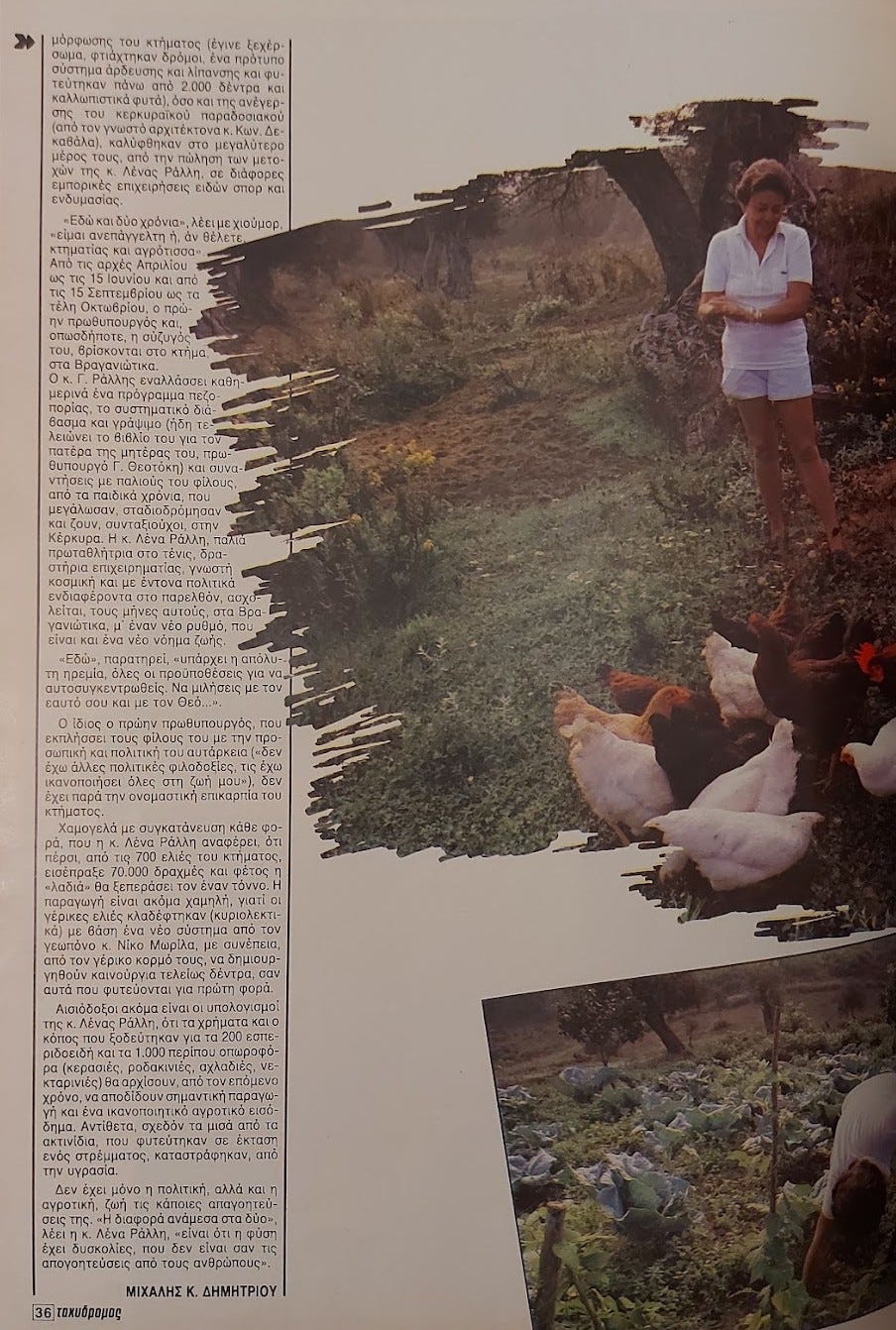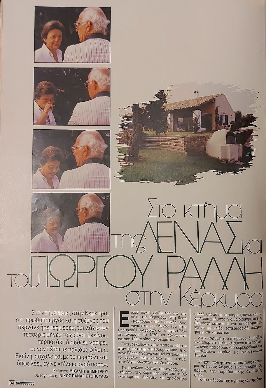 Στο περιοδικό «Ταχυδρόμος» της 15ης Νοεμβρίου 1984 είχε δημοσιευθεί ένα αφιέρωμα στο ζεύγος Γεωργίου και Λένας Ράλλη, οι οποίοι είχαν φωτογραφηθεί στο κτήμα τους στην Κέρκυρα, εκτάσεως 100 περίπου στρεμμάτων!