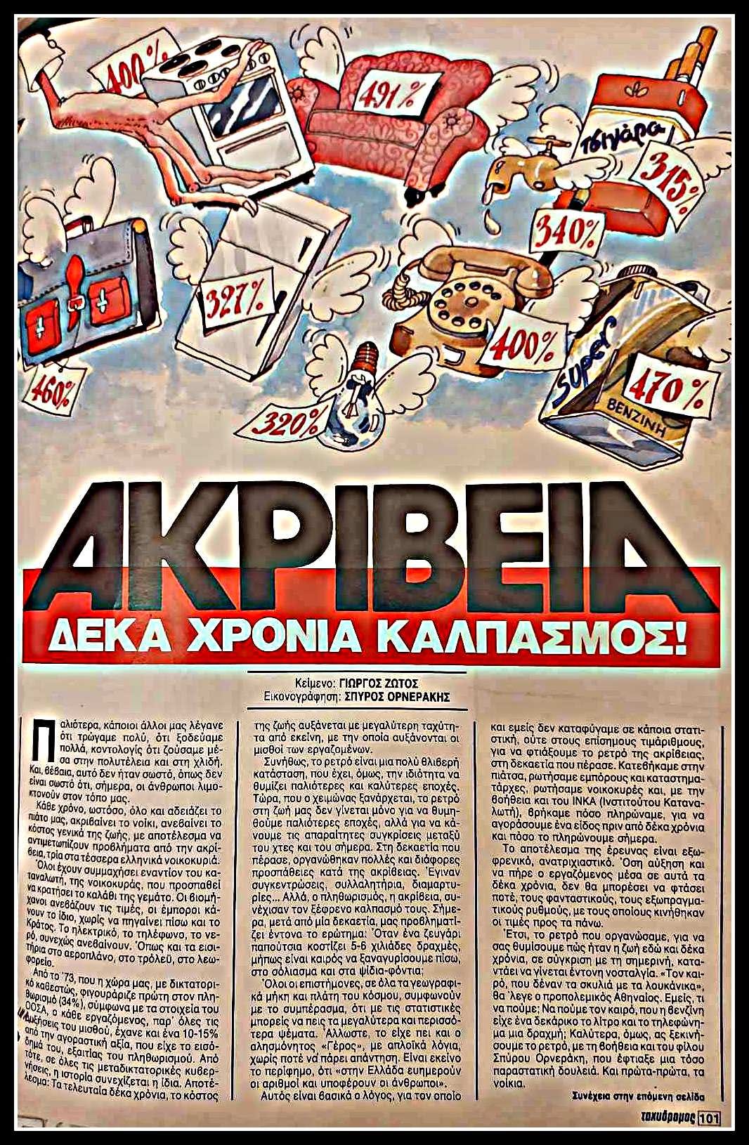 Στο ίδιο τεύχος του περιοδικού «ΤΑΧΥΔΡΟΜΟΣ» από το 1984 που αναφέρθηκε παραπάνω, με τις φωτογραφίες του ζεύγους Ράλλη στο κτήμα τους στην Κέρκυρα, υπήρχε δημοσιευμένο ένα άλλο υπερπολύτιμο λαβράκι: άρθρο του Γιώργου Ζώτου (σελ. 101 επ.) με τίτλο «Ακρίβεια. Δέκα χρόνια καλπασμός», με στατιστικά στοιχεία για τις αυξήσεις-φωτιά που σημειώθηκαν κατά την δεκαετία 1974-1984.
