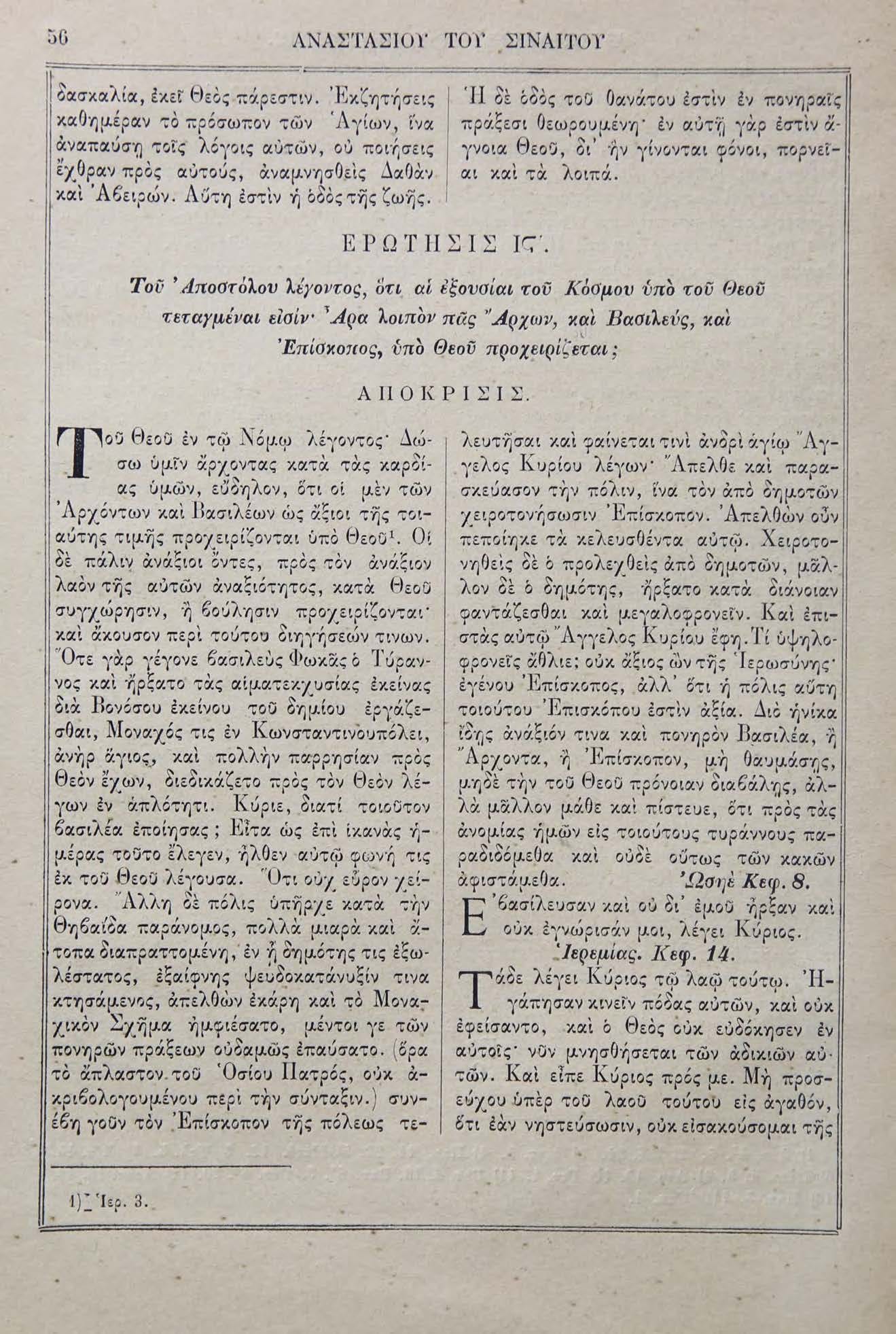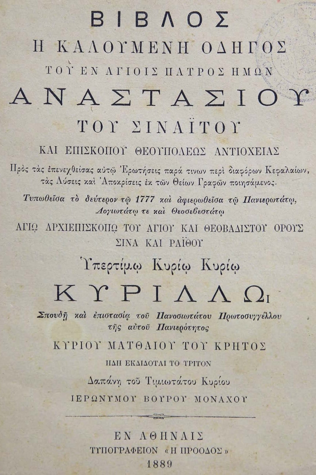 Βίβλος η καλουμένη οδηγός του εν αγίοις πατρός ημών Αναστασίου του Σιναΐτου και Επισκόπου Θεουπόλεως Αντιοχείας, Εν Αθήναις, 1889, Ερώτησις ιστ΄, σελ. 56.